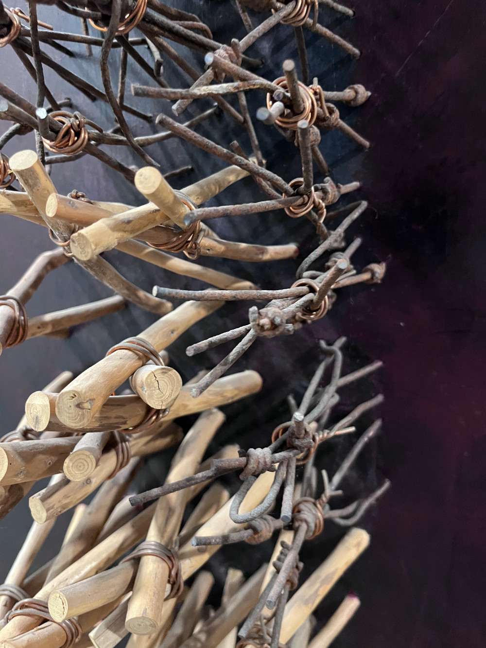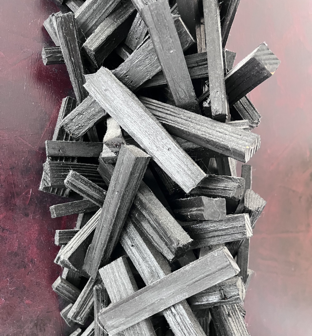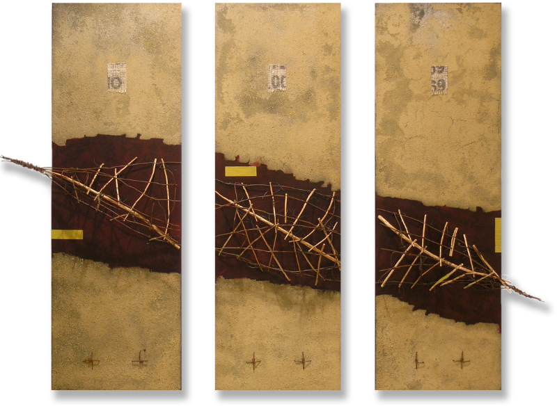 Diese Arbeiten verwenden Redwood-Äste, die ich nach Stürmen auf Kings Mountain gesammelt habe. Die Straßen waren übersät mit herabgefallenen Ästen, die äußere Rinde aufgeplatzt und abziehbar. Ich sammelte die inneren Stöcke und hortete sie im Atelier.