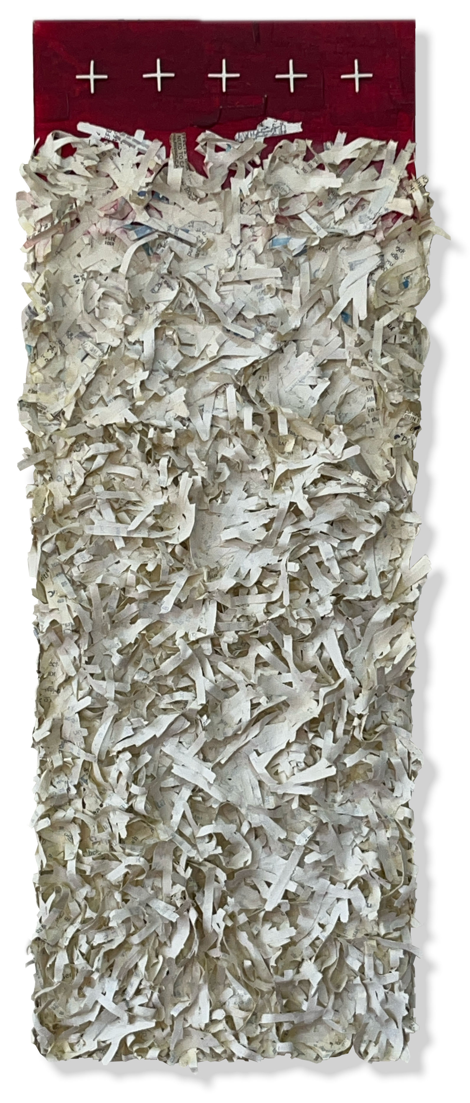 Es begann als Bürodokumente — Text, Informationen, Aufzeichnungen — nun durch einen Schredder zu Schnitzeln reduziert. Fragmente von Wörtern noch sichtbar, aber nicht mehr lesbar. Chaos unten, Ordnung oben. Serendipität als Methode: Das Stück entstand, als die Papierschnipsel auf den Boden fielen und das Ergebnis gefiel.