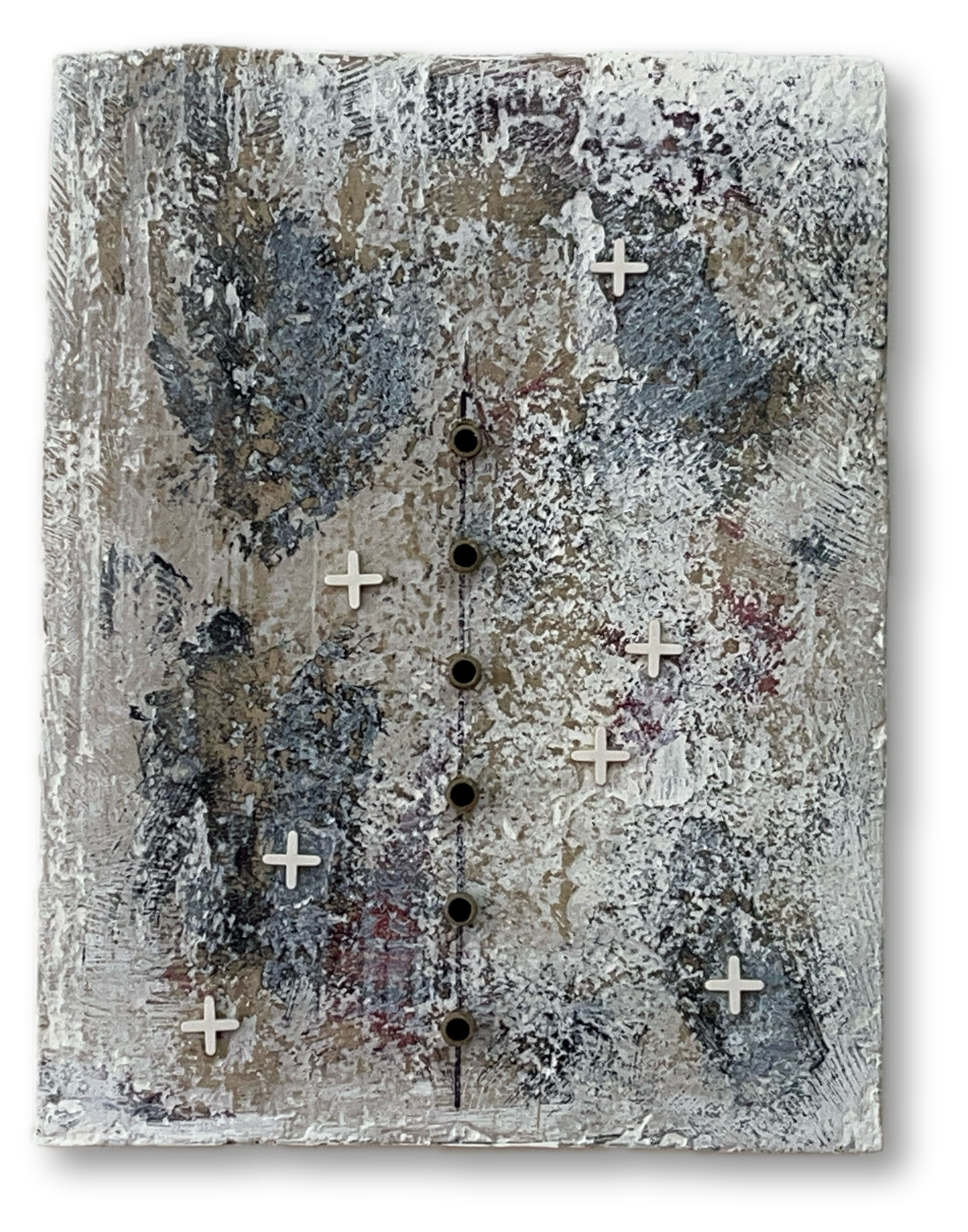 Cardboard slab covered with paper mâché clay, painted and scraped. A spine of small paper tubes runs down the center — a gift from a studio neighbor. Tile spacer crosses scattered across the surface.