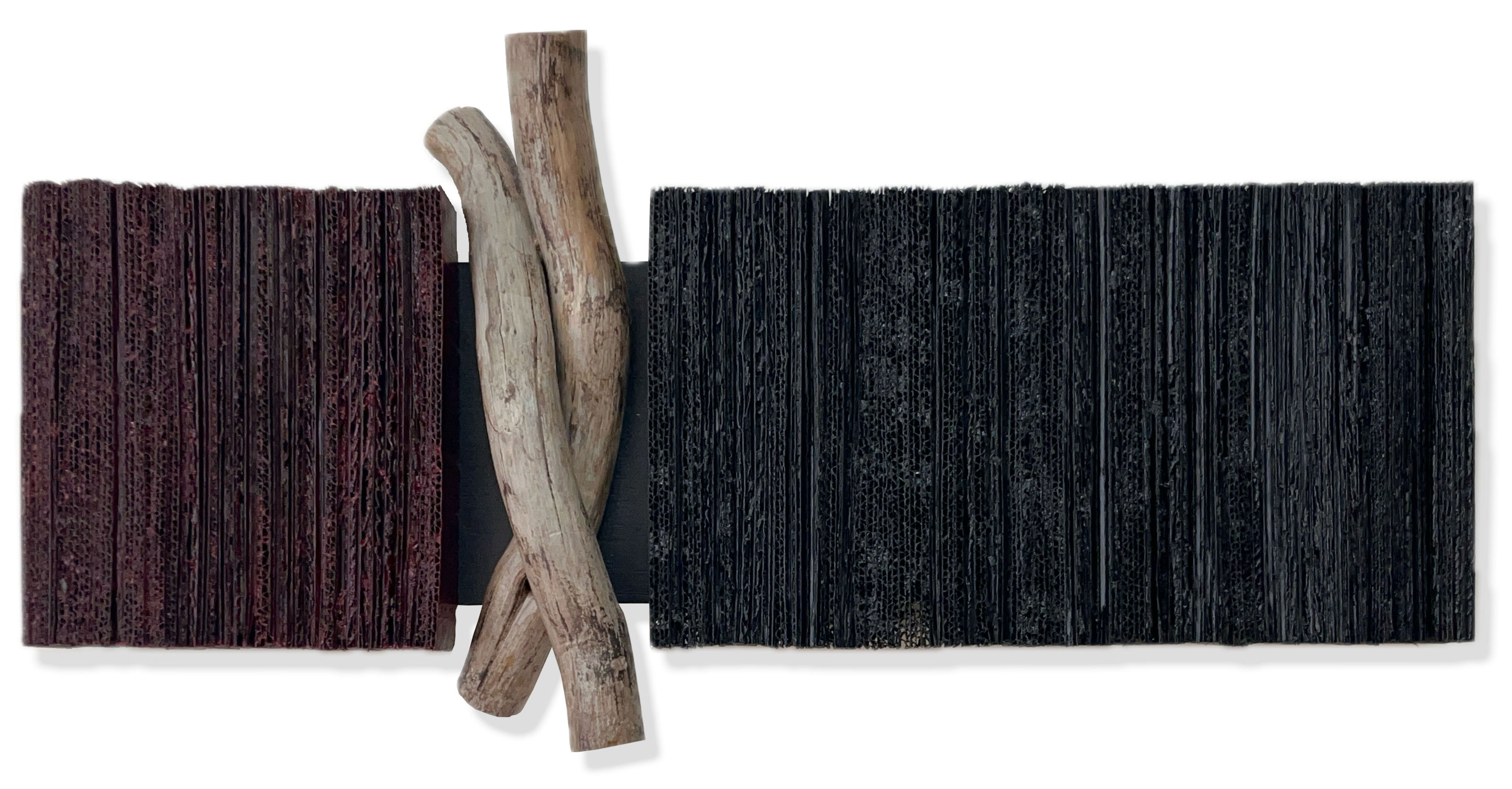 Two panels of laminated cardboard strips — deep red-brown on the left, black on the right — joined by a dark center band. Driftwood branches cross at the junction, weathered and pale against the vertical texture of the cardboard.