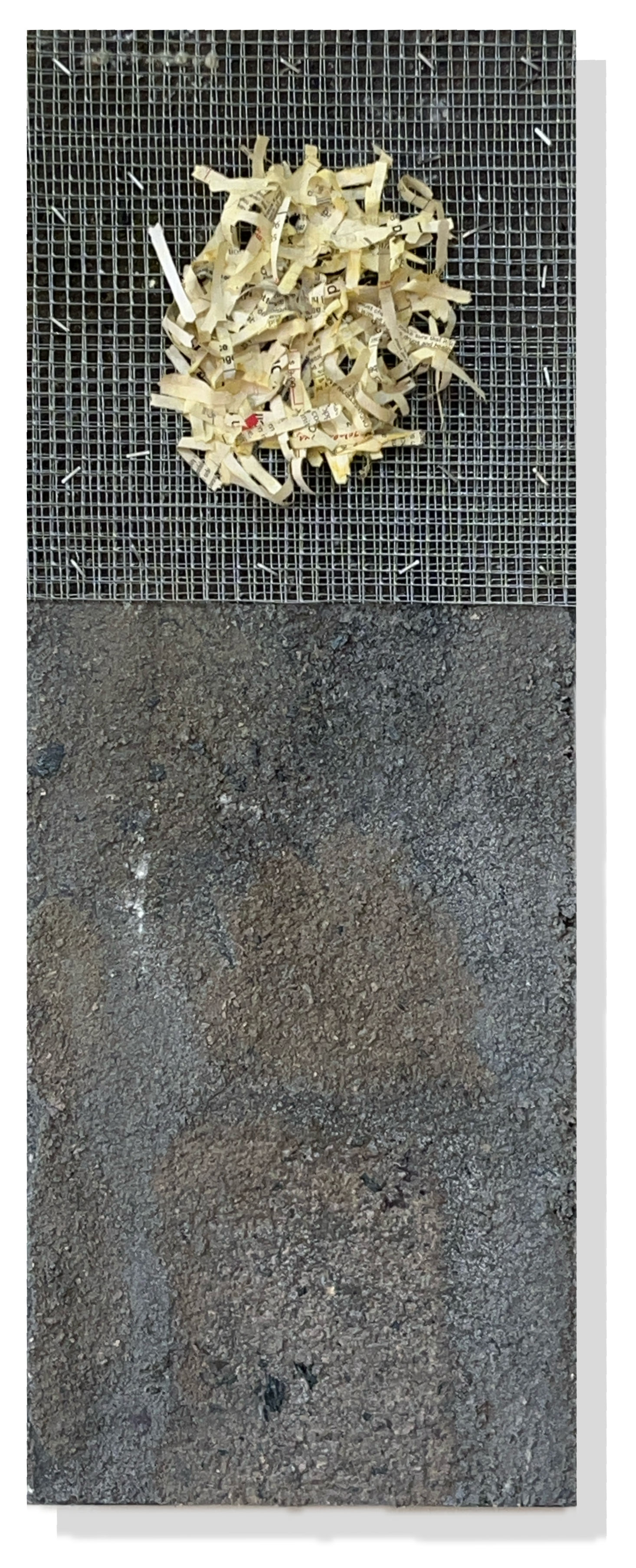 Wire mesh over a wood panel coated with ash soaked in urethane — the surface reads like weathered stone or scorched earth. A cluster of shredded paper sits on the mesh, still tangled, holding its shape.