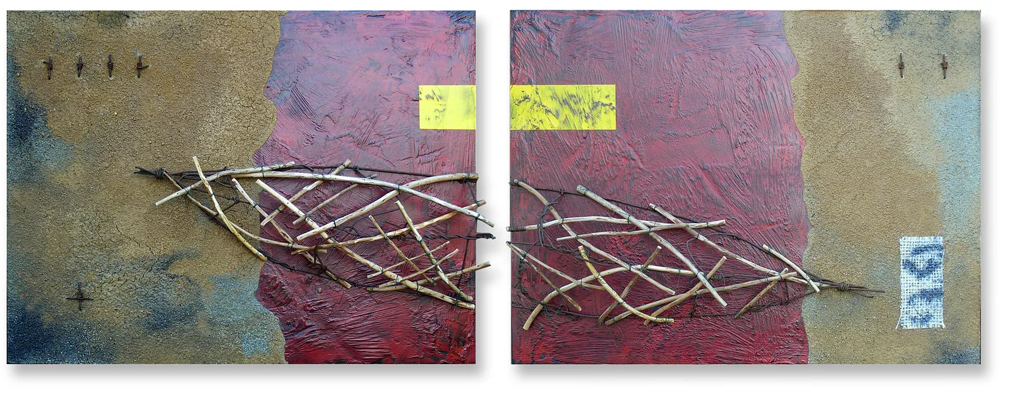 This one pushes the same idea further — two panels, the boat bridging the gap between them. The red is thicker here, more visceral. The yellow rectangles and small grid patch interrupt the flow, the way a single blue stick interrupted the chicken wire circle years earlier. Small choices that keep things alive.