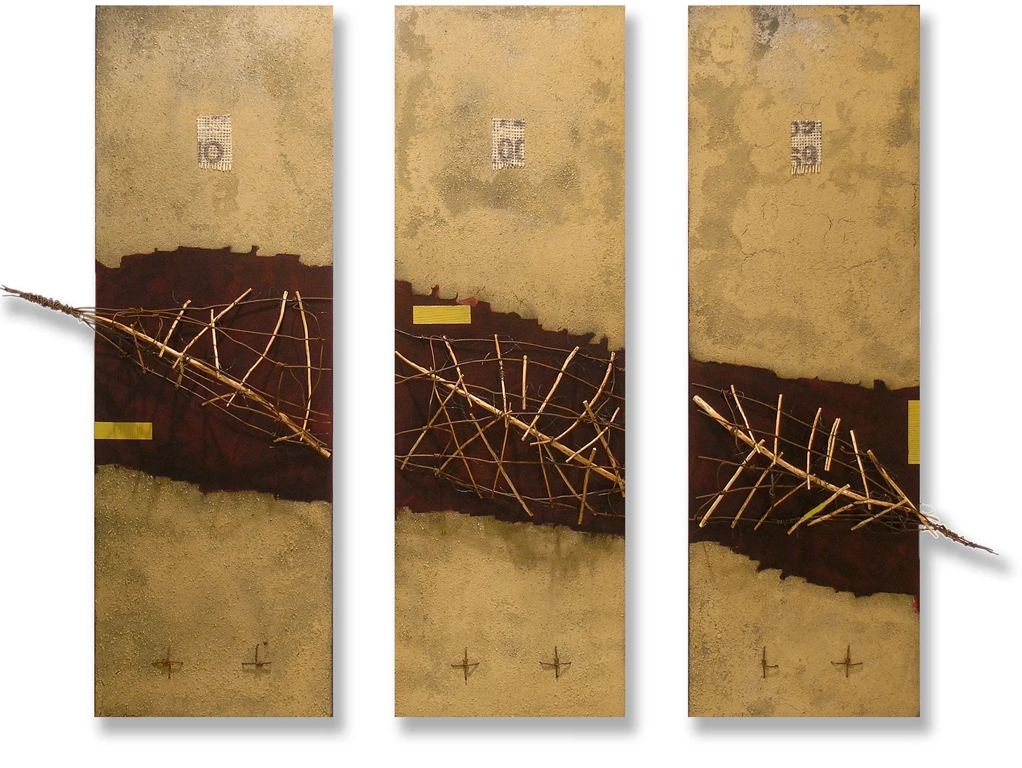 This piece stretches a redwood stick boat skeleton across three panels, crossing a dark red channel. The boat refuses to stay contained in any single frame. It's in transit, moving through.